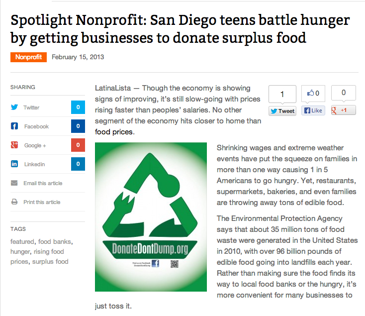 10/10/12 “Encinitas teen’s non-profit puts food in hands of hungry instead of landfills” Encinitas.Patch.com
